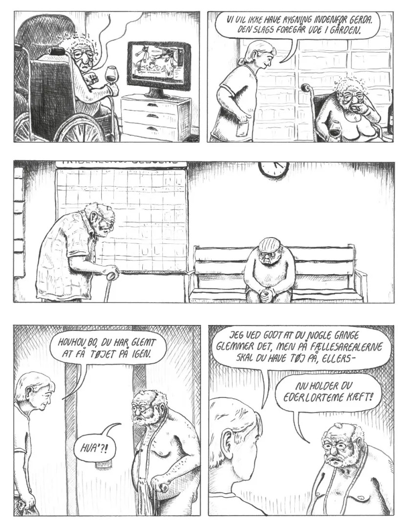Selve tegneserien starter foran hovedindgangen, hvor man følges med beboeren Bo ind. Her er det lige så trøstesløst som udendørs. En beboertavle viser, hvem der bor på hvilke værelser – og så er et værelse naturligvis tomt, fordi livets gang betyder, at der er jævnlig udskiftning på værelserne. Bo tøffer videre forbi et opholdsrum, hvor Birthe Kjærs Arriverderci Franz spiller. På en sofa ligger en beboer og sover, en anden sover i sin kørestol og i baggrunden hænger yderligere to ind over et bord uden at udstråle den helt store energi. Først på side tre ryger billedrammen ned under bæltestedet på Bo, så man kan se, han render rundt i en halvt åbentstående skjorte uden noget på benene.
