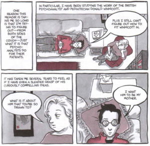 ‘Are You My Mother?’ har derfor præg af en lettere desperat og i sidste instans forgæves søgen efter den erindring, den begivenhed, der kan give mening og struktur til Bechdels liv. Og fordi denne stræben mislykkes, fordi Bechdel ikke formår at finde den episode, der en gang for alle kan afklare forholdet til hendes mor, så opleves de fortælletekniske greb, der virkede så godt i ‘Bedemandens datter’, ikke som en integreret og naturlig del af historien, men som udefrakommende og forstyrrende elementer. Det er vanskeligt at finde rundt i kronologien (der er en oversigt/tidslinje over Bechdels liv, terapeuter og kærester på s. 22 i bogen, der er uundværlig for at hitte rundt i forløbet). De litterære og psykoanalytiske referencer og eksempler bryder læsningen op i mindre, usammenhængende bidder. Og sammenhængen mellem Bechdels egen udvikling og forholdet til moderen er sine steder svær at følge.