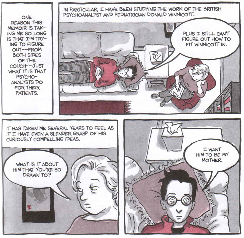 Et bærende element i ‘Are You My Mother?’ er således Bechdels utallige terapi-sessioner, hvor hun i samtale med skiftende terapeuter forsøger at fortolke og forstå forholdet til sin mor. Flere gange når Bechdel frem til, hvad hun selv mener, er afgørende indsigter: erindringer om episoder fra hendes barndom, som hun synes forklarer og giver ny betydning til hendes relation til hendes mor. Ude fra betragtet er disse episoder dog uden undtagelse rørende banale. Der er historien om dengang moderen påtog sig at hjælpe sin datter med at skrive dagbog. Og historien om de gange hvor Bechdel for at få sin mors opmærksomhed, legede, at hun var syg og skulle bruge krykker. Og historien om den aften, hvor Bechdels mor for første gang undlod at kysse sin datter godnat.