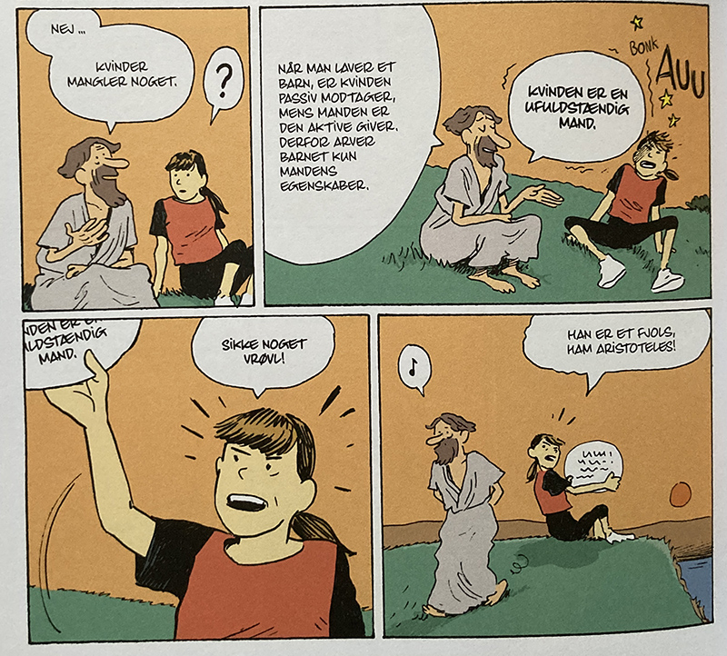 Romanen er præget af docerende monologer fra en midaldrende mand til en ung kvinde. Her har Zabus gennemtænkt trukket romanens få henvisninger til manglen på kvindelige filosoffer helt i front. Tegneseriens Sofie sprutter vredt over den åbenlyse sexisme menneskehedens historie er fyldt med. Det kommer til udtryk i en underholdende sekvens, hvor Sofie flår Aristoteles’ talebobler til sig, da han begynder at tale om sit nedladende syn på kvinder. Det er desuden et godt eksempel på, hvordan Zabus ved, hvornår han skal overlade forsædet til Nicoby.