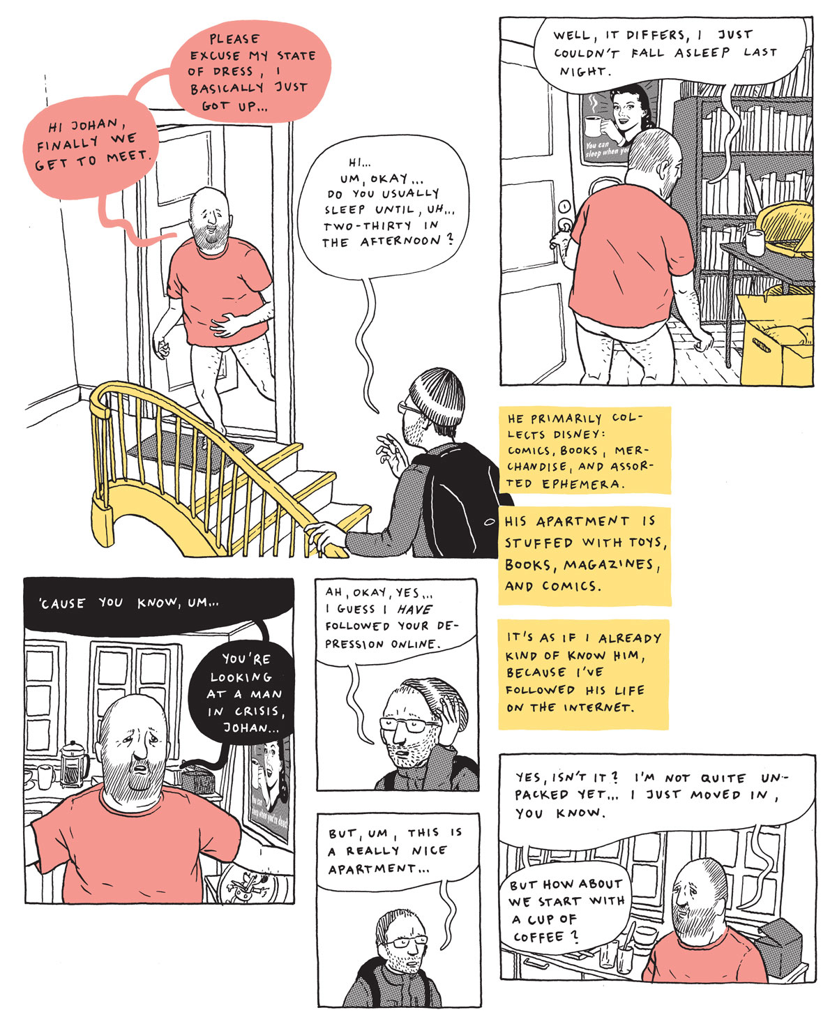 Joanna Hellgrens ‘Scout’ og Johan F. Krarups ‘Nostalgia’ er to af de mere traditionelle tegneserieindslag, og samtidig de to mest realistiske historier i hele samlingen. Her bliver uudtalte menneskelige relationer og social akavethed krydret med magtspil og samvittighedskvaler til en hårrejsende psykorealisme, som sætter fingeren lige på vores mest ømme punkter. Av, hvor er det godt.Absurde, symbolske og pivåbne historier er der mange af i samlingen, og det kan godt føles som en lovlig stor mundfuld at skulle rumme det hele på én gang som læser. Bortset fra påfaldende økonomisering med ordene og den omsiggribende trend med (gnidrede) blyantstegninger, så er der ikke meget rød tråd i bogen. Der skiftes gear, anslag, tempo, stemme og dynamik så radikalt og så mange gange undervejs, at læsningen ikke bliver helt flydende. Men sådan er antologiens natur jo desværre ofte. Man ånder derfor lettet op, hver gang man kommer til et indslag, der minder lidt om den mere velkendte tegneserieform med rammer, replikker og fremadskridende handling. Og de mest udflippede eksperimenter og kunstnere står måske derfor ikke helt ligeså stært frem i feltet i denne antologi, som i de lidt mindre monumentale, danske antologier ‘Blæk’ (Politikens Forlag 2006) og min personlige favorit, ‘From Wonderland With Love’ (Fantagraphics/Aben Maler 2009).