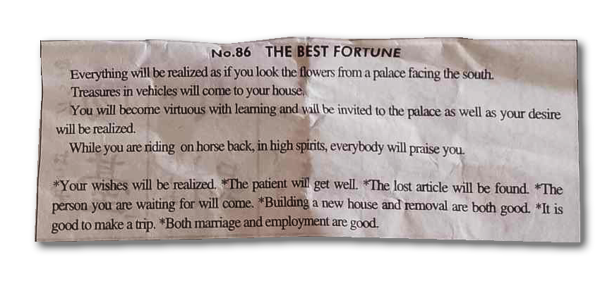 Den første aften lægger jeg 100 yen i en turistet spå-din-fremtid-bod, og får at vide at jeg må være på en skæbnerejse, for det er den heldigste spådom, man kan trække.
