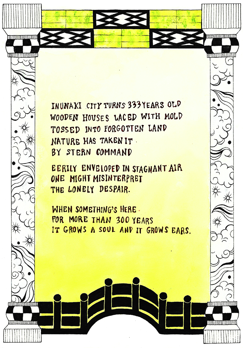 Jeg går straks i gang med at skrive det digt, der skal være omdrejningspunktet, og skitse thumbnails og bruger den inspiration, jeg har indsamlet på mine cykelture: fotos af teksturer, mønstre og farvetemaer fra lokale bygninger, flora og fauna. Digtet er min version af legenden om Inunaki. Jeg inddrager filosofien om tsukumogami, da de objekter, der blev efterladt for 333 år siden, må savne menneskelig berøring.