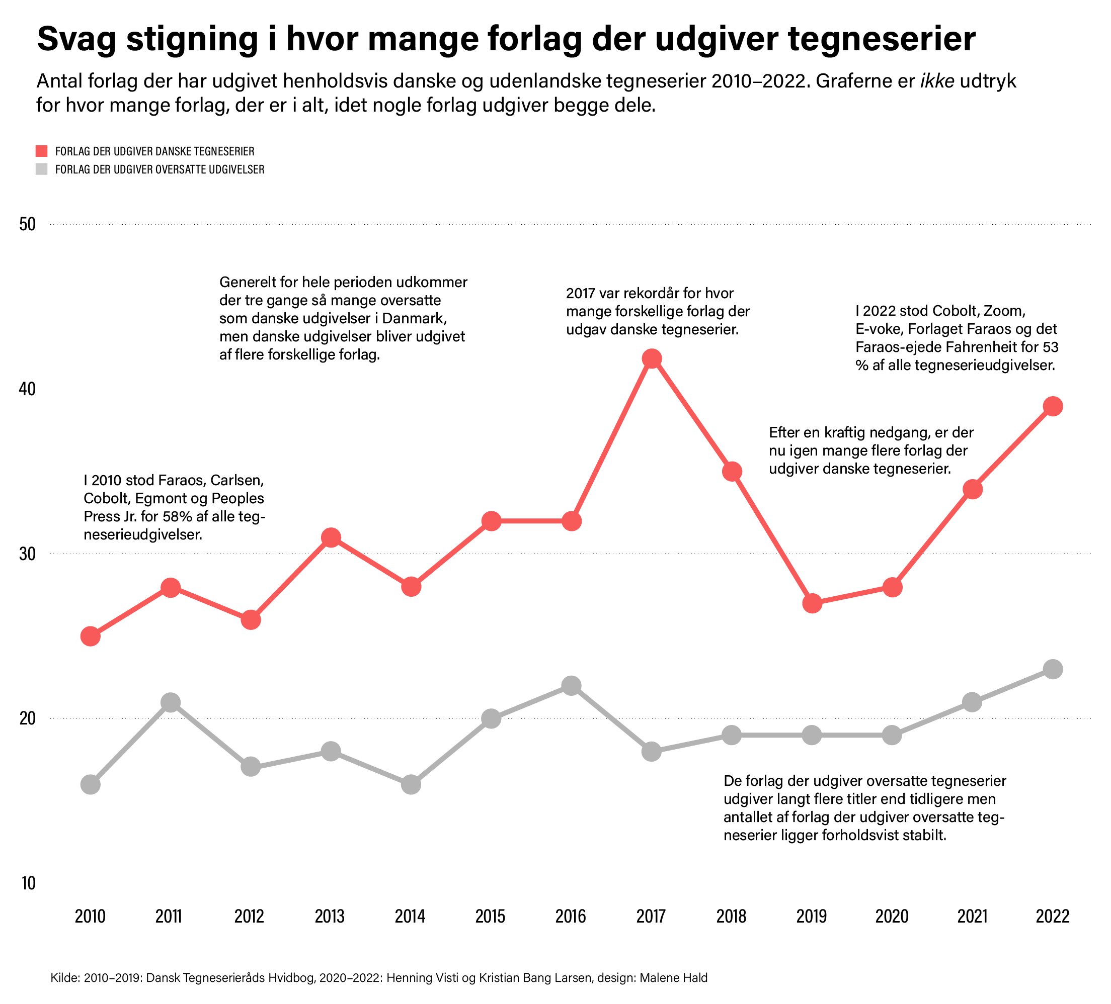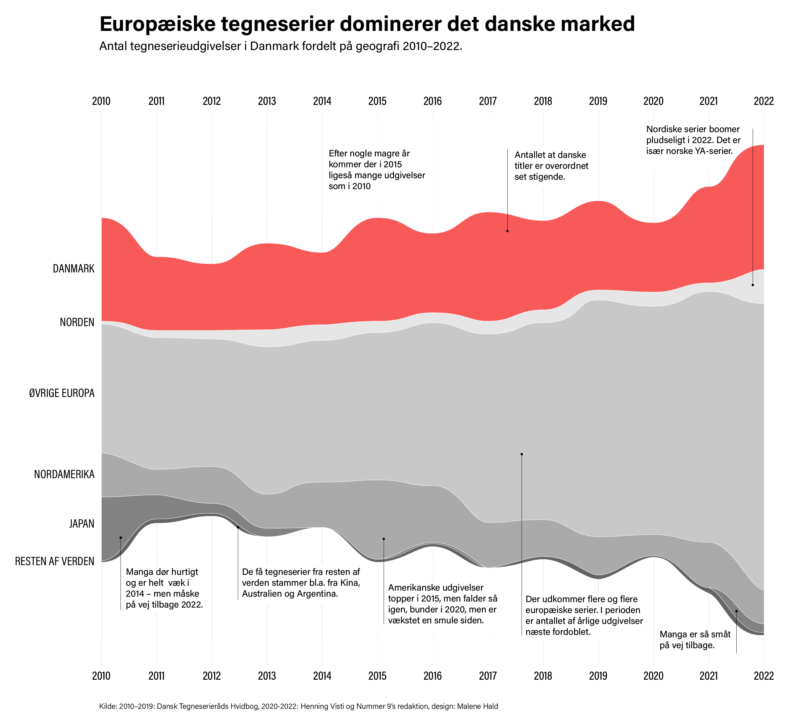 For de japanske mangaserier er udviklingen endnu mere markant: i 2010 var 18 % af alle udgivne titler Manga, men derfra gik det hurtigt ned ad bakke, og fra 2014 til 2021 kom der stort set ingen japanske serier på dansk. Omvendt er det gået de nordiske serier – fra i mange år at ligge stabilt med ganske få udgivelser er tallet steget markant i 2022, hvor de 24 udgivelser fra vores broderlande er en fordobling i forhold til 2013, der var det hidtidige rekordår for nordiske tegneserier.