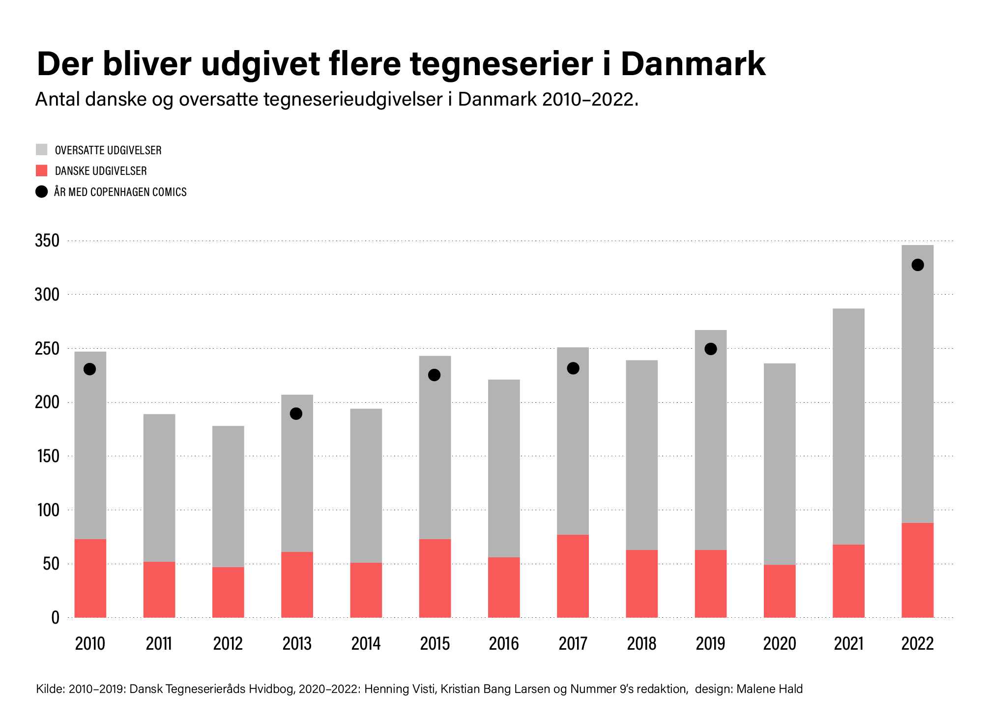 I denne og en række kommende artikler, vil jeg kigge på udviklingen inden for danske tegneserier siden 2010. Her begyndte Dansk Tegneserieråd nemlig at udgive en årlig hvidbog med oversigter over alle tegneserieudgivelser på dansk. Der er således et stærkt datagrundlag, som ikke findes for perioden inden. Hvidbogen er ikke udkommet siden 2019, men i årene efter har vi på Nummer 9 selv indhentet data på udgivelser i forbindelse med nomineringsprocessen til Pingprisen (som vi står for). Her har vi fået uvurderlig hjælp af Henning Visti, der stod for registreringerne til hvidbogen.