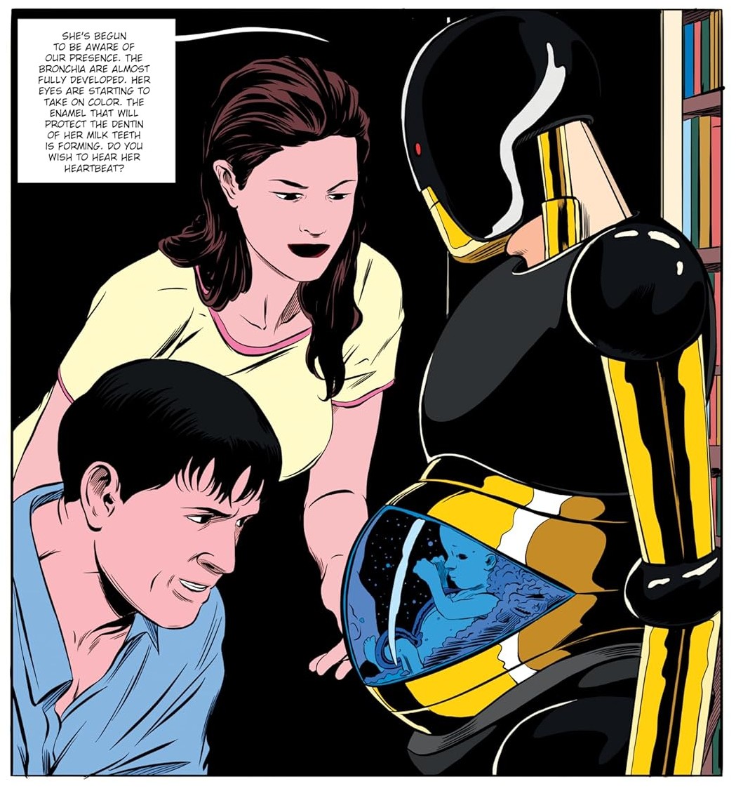 Men i fortællingens fremtid er graviditeten overladt til parrets hus-robot Mikki, der udover en voksende mave står for de praktiske opgaver i hjemmet og tilberedningen af hver aftens gourmet-måltid.