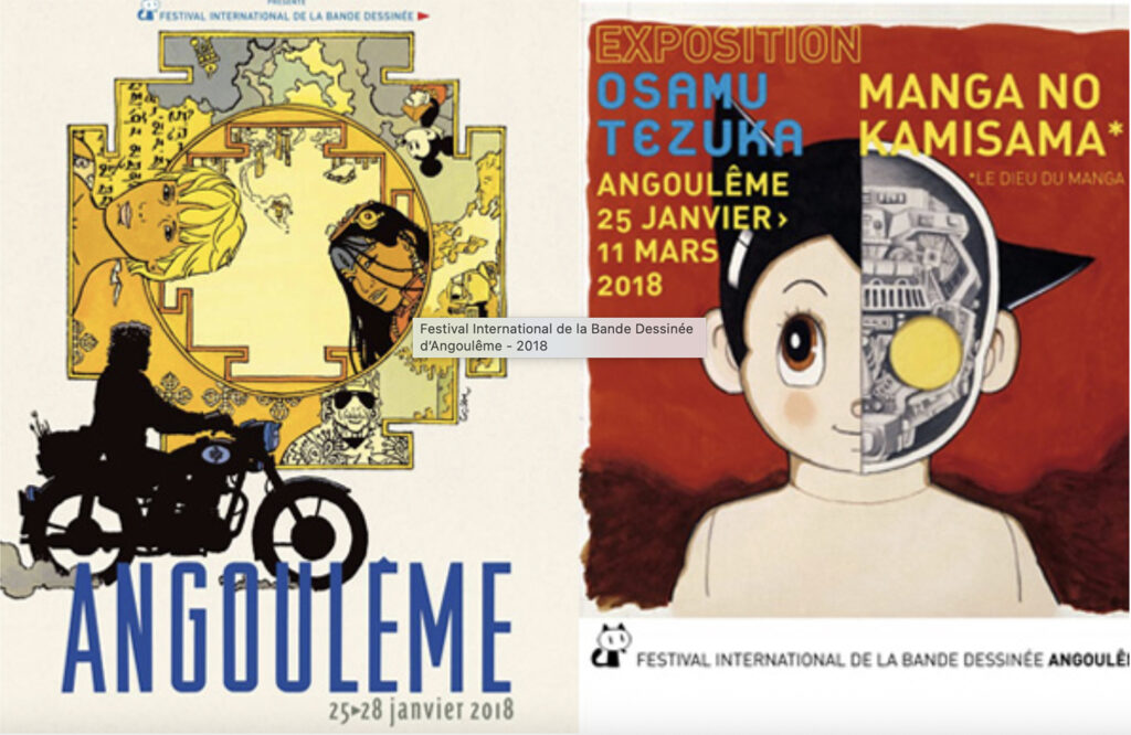 Til venstre ses plakaten for festivalen i 2018, hvor Cosey var præsident og til højre ses plakaten for særudstillingen for Osamu Tezuka.
