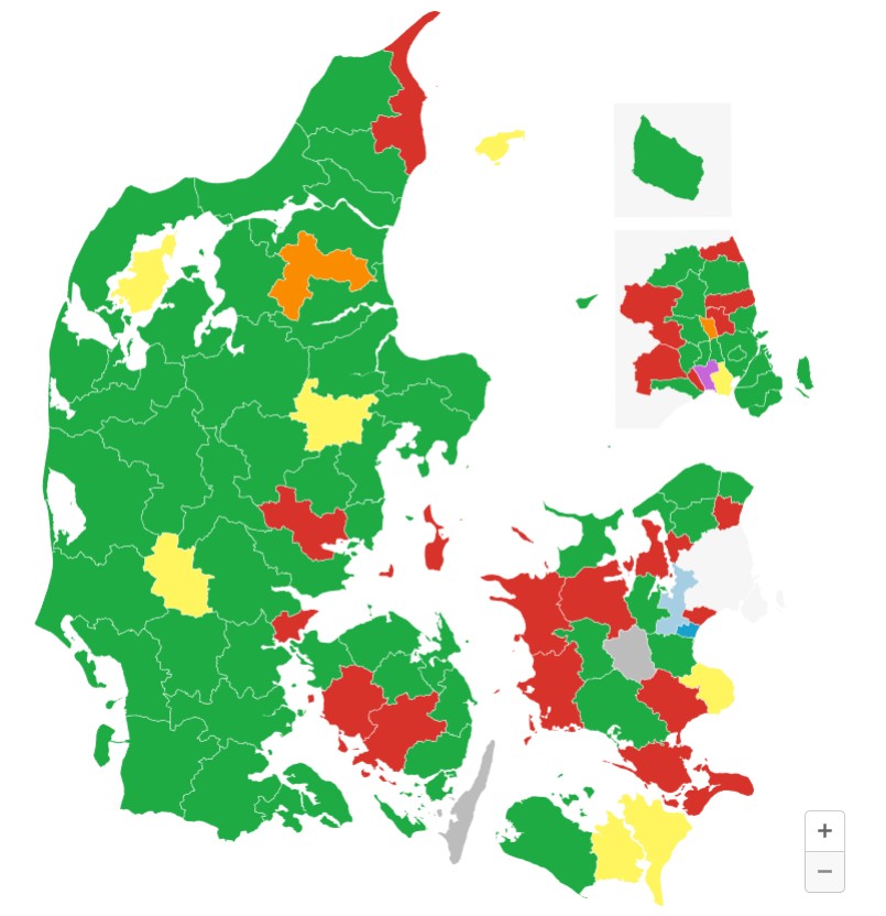 Bibliotekernes Børnevalg har udarbejdet denne visualisering af, hvem der vandt i de forskellige dele af landet. I de grønne områder fik Møgmis flest stemmer, i de røde områder valgets nummer 2, Hunden Ib, mens de gule områder blev vundet af nummer 3, SOL. På landsplan altså en klar sejr til Møgmis.