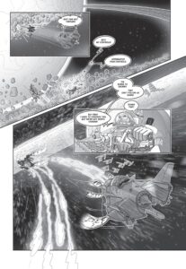 Både gammelt og ungt. Den første er Nikolaj Bechs Jem and Bot: Striking Out. Hvor en del studerende på Graphic Storytelling kommer med et indgående forhold til manga som de først skal have banket ud af sig (okay, det er muligvis ikke sådan kunstskole fungere…), så har vi her at gøre med en kunstner, der har valgt at afslutte sin uddannelse med en tegneserie, der sagtens kunne være skrevet lige midt i 1970’ernes fransk-belgiske sci-fi-bølge. Jem er rumpirat, der er lidt for hurtig på aftrækkeren, og hendes makker Bot er ikke altid med på den konstante freestyle-tilgang til problemløsning. Komplet med dårlige scorereplikker og naturalistiske rumskib-kamp-manøvrer: hverken stilen eller fortællingen er noget for mig, men det er sejt at kunne lave en tegneserie, der ligner noget, nogens onkel kunne finde i kælderen (okay, så gammeldags ser den trods alt ikke ud, men overdrivelse fremmer forståelsen!).