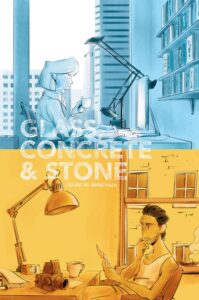 Lad mig bare starte med den bedste. Det er naturligvis et spørgsmål om smag, og alle kan selv gå online og finde deres egen favorit, og i sidste ende er der jo tale om en eksamen… ikke en konkurrence. Ikke desto mindre vil jeg gerne fremhæve norske Erland Mo Andreassens Glass, Concrete and Stone. Den vinder ikke for bedste titel, nej, men det er også fordi, der faktisk er et par ret gode titler i bunken. Forsiden giver klare mindelser om Asterios Polyp med sit fokus på arkitektur og den klare kontrast mellem blå minimalisme og en varm og venlig orange. Helt så store mytologiske armbevægelser afholder Andreassen sig fra, og fortællingen kredser i stedet om en gammel bygning, der trues med nedrivning. Den til tider komplekse fortælling springer ofte frem og tilbage mellem de to hovedpersoner, deres spirende kærligheds-dialoger, diverse drømme og minder samt mandens samtaler med bygningens andre beboere om deres historier og erindringer. Disse spring forstår Andreassen at pege på med subtile visuelle kneb –