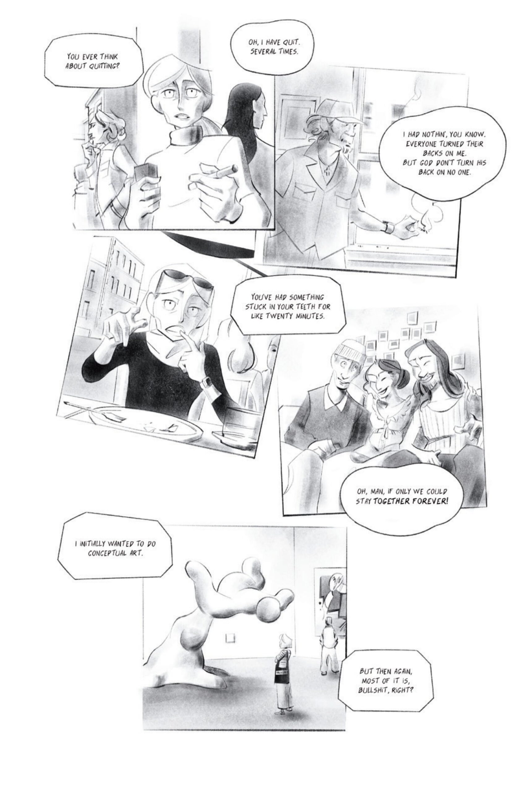 eksempelvis gennem udformningen af taleboblerne. Men det er ikke kun stiløvelser og narrativ kompleksitet, nej, jeg synes faktisk, jeg har mødt nogle ægte mennesker, der foretager sig noget meningsfyldt i en verden, jeg kan se for mig. Plus at det var interessant. Så vidt så vellykket. Med sine knap 80 sider fremstår denne tegneserie jo nærmest som en færdig bog. Og det er den faktisk ikke ene om.